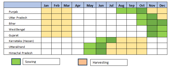• Total production for 2018-19 is estimated at 51.5 million tons compared to 49.50 million tons in previous year. Crop year is taken as Nov- Oct, as fresh arrivals starts from Punjab in Nov. |