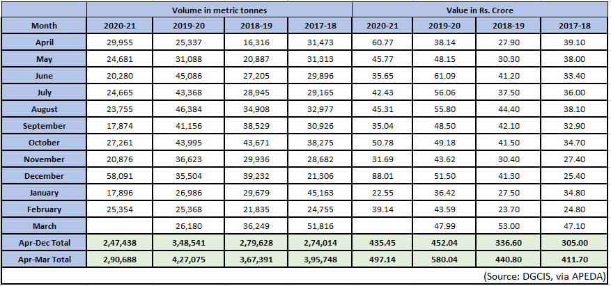 The table above depicts the country-wise exports from India on yearly basis. Normally 3- 4 lakh tons of potato are exported every year. Approximately 80% of India’s total potato exports are to Nepal followed by Oman, Sri Lanka, Malaysia, Mauritius and Malaysia. |